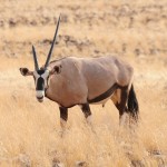 Auf den nach Routenbeschreibung letzten ca. 70km wird es plötzlich etwas interessanter. Es lässt sich allerlei Getier am Wegesrand blicken, z.B Springböcke, Oryx-Antilopen und Strauße. Mit diesen Laufvögeln ist das so eine Sache. Sie machen ihrem Namen alle Ehre und begeben sich sofort auf die Flucht, sobald man neben ihnen anhält. In einer etwas tuntigen Art und Weise verabschieden sich sich ein deutliches Stück weiter weg. Zu weit für ein ordentliches Foto.