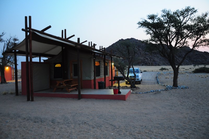 Einer seiner Kollegen kennt aber diese Lodge und so kommen wir dann doch noch an die richtie Wegbeschreibung. Weitere 25km werden fällig. Nach ca. einer halben Stunde und wieder mal nach Sonnenuntergang fahren wir dann endlich auf das Gelände des Desert Camp auf. Jawohlja, das ist die Unterkunft, die ich im Internet gesehen habe. Zelte mit Fundament. That’s it!